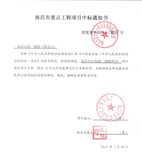 2014年2月25日,南昌市第一建筑工程公司南昌工作部在總公司領(lǐng)導(dǎo)的指導(dǎo)下,以科學的施工方案為前提,確立合理的下浮系數(shù)及投資回報率,在參與投標的多家競爭對手中脫穎而出,一舉中得“南昌市紅角洲二期路網(wǎng)工程BT項目”,公司已于2014年3月6日收到業(yè)主方發(fā)來的中標通知書。